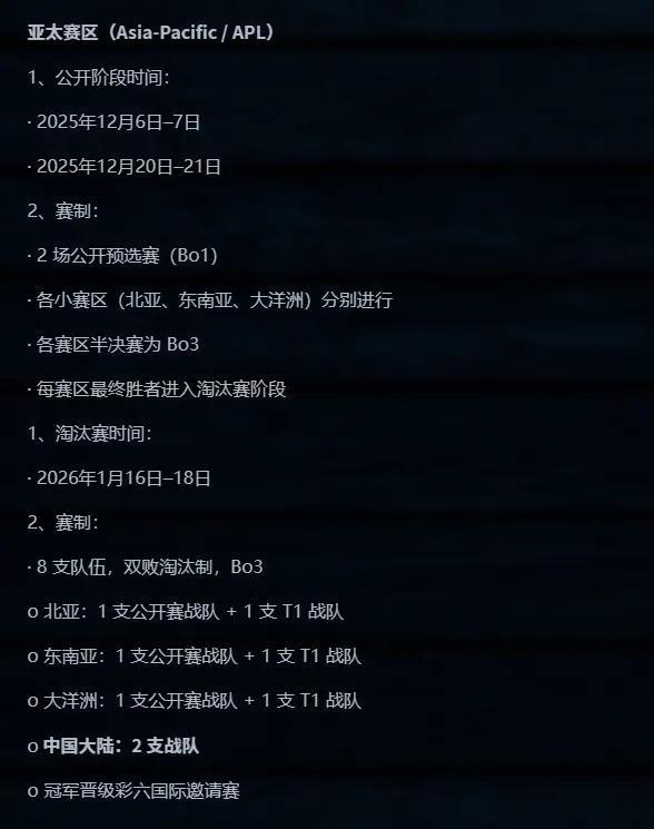 其中,亚太赛区除在北亚、东南亚、大洋洲3个子赛区筛选6支队伍外,还将首次为中国大陆地区的队伍提供2个队伍名额,一同争夺SI门票。